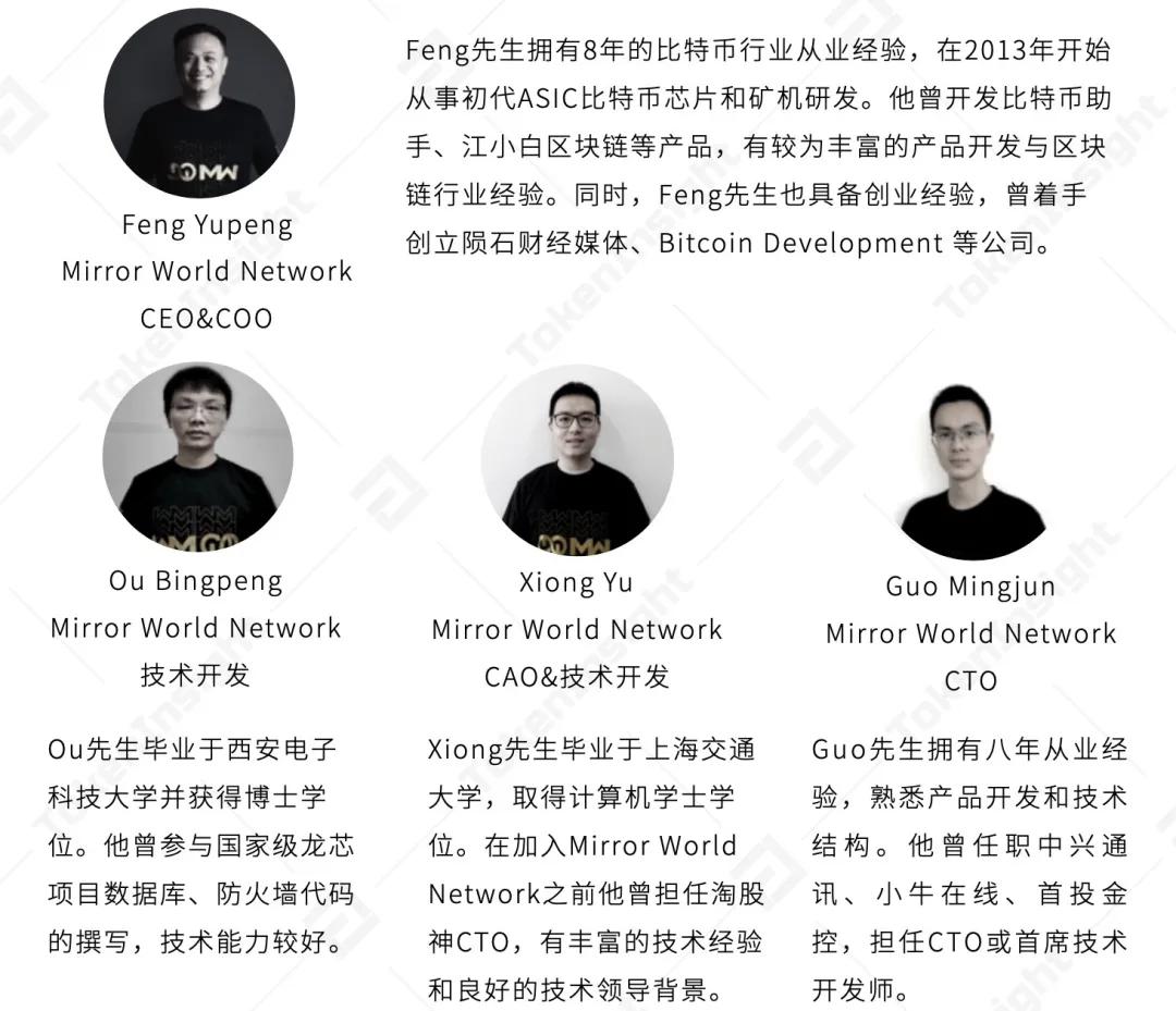Mirror World Network团队成员共有35人,由管理团队、开发团队和营销团队构成,其中开发人员占比较高,达60%。Mirror World Network创始人具有较为丰富的比特币挖矿和代币经济模型经验,整体具有较好的行业背景。此外,团队未来将持有12%的平台通证且分三年解锁。Mirror World Network核心团队成员背景如下: