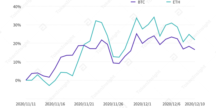BTC & ETH 近30天市值变化,截至12月11日早9点,来源:tokeninsight.com