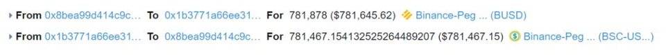 为了后续更统一方便地转移,项目方先将 1,137,821 BUSD 换成 1,137,477 USDC,将 781,878 BUSD 换成 781,467 BSC-USD。