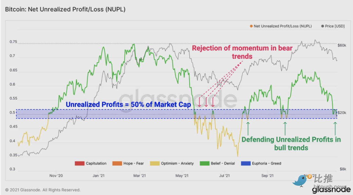 Glassnode 报告指出:“根据这张图表,当前的价格下跌似乎类似于更大的牛市趋势中的修正——与 5 月份 NUPL 完全切入 50% 水平形成鲜明对比,这个交易区间可能正在定义牛熊线,一个关键的风险是,如果它无法保持下去,是否会发生向不利条件的过渡”。