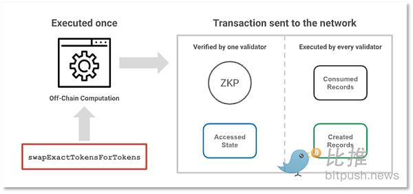 在 Mir 上,所有应用程序的逻辑都在链下执行。对于验证者,没有令牌、应用程序逻辑或状态存储的概念,甚至没有标准化的签名方案(验证共识是需要令牌的,这里仅指交易验证)。交易只是创建和使用通用记录records(Mir上的基本状态单元,是对应用程序状态和逻辑的承诺。它可以被认为是以太坊账户状态的快照),并通过证明进行验证。