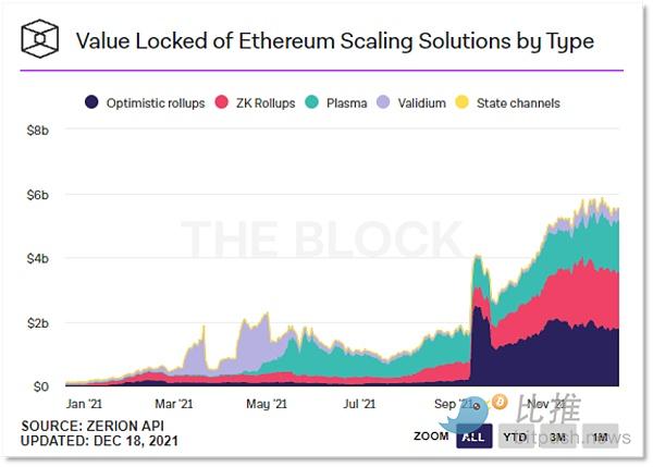 据The Block数据显示,ZK-rollups整体市场份额证明,其是目前市场上的主要二层扩容解决方案之一,例证之一是ZK-rollups、Optimistic-rollups和Plasma三者近期的TVL(链上加密资产锁仓总价值)都在15亿美元到25亿美元之间,其中Optimistic-rollups的市场份额可能稍多于其他二者。