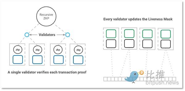 首先,消除了验证者在加入网络时验证历史交易的需要。现有链为了允许新验证者赶上链的最新状态,往往会限制吞吐量。而Mir的新验证者只需要简单下载三个部分的内容,进行验证即可,下载内容包括一个存储着协议内创建了每条记录的可追加日志(Commitment Log) 、顶层的节点、日志中判断活动还是非活动数据的组建(Liveness Mask)。采取这样的方式,就无需限制链的吞吐量,以等待新验证者追踪。