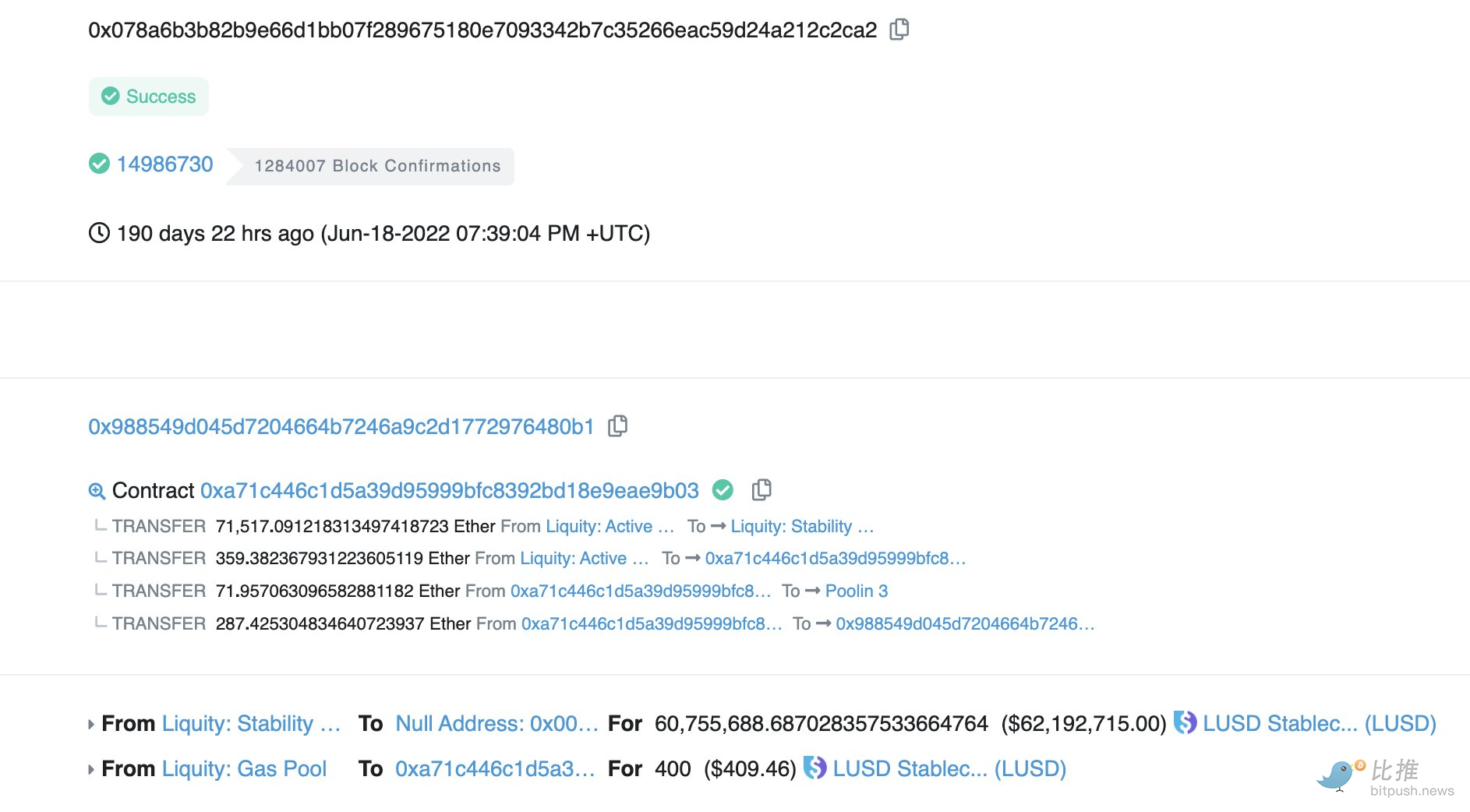 6 月 18 日,一个以 0×2291 为开头的多签地址在 Liquity 上被清算了大约 6100 万美元,清算该头寸的机器人仅通过该笔清算就获得了 359 ETH,而这一清算金额也比 2021 年的最大清算额高出了 69%。