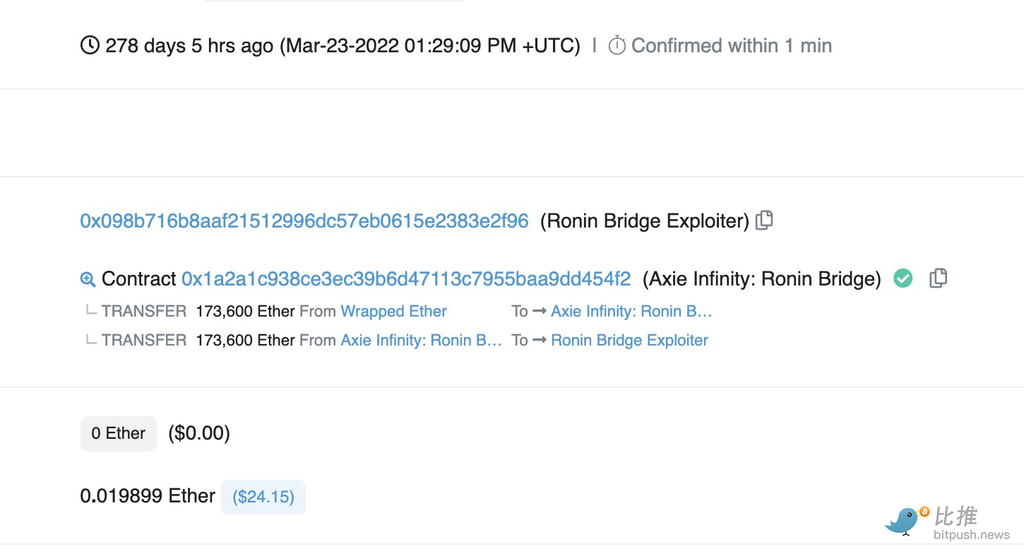 3 月 23 日,Ronin Bridge 遭到黑客攻击,攻击者通过控制九个验证节点私钥中的五个(4 个 Sky Mavis 和 1 个 Axie DAO)从而盗取大约 6.5 亿美元资金(173,600 枚 ETH 和 2550 万枚 USDC)。