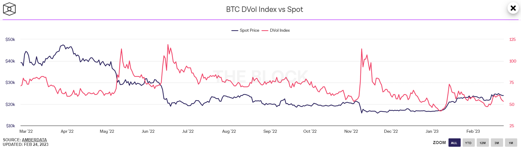 此外,Deribit 的比特币波动率指数 (DVOL) 仍接近历史低点。它在2月24日收于 53,低于早些时候的每周高点 60。这与今年早些时候创下的历史低点 43 相差不远。DVOL 在加密市场看跌时往往会飙升,因此,该指标保持稳定是一个令人放心的信号。
