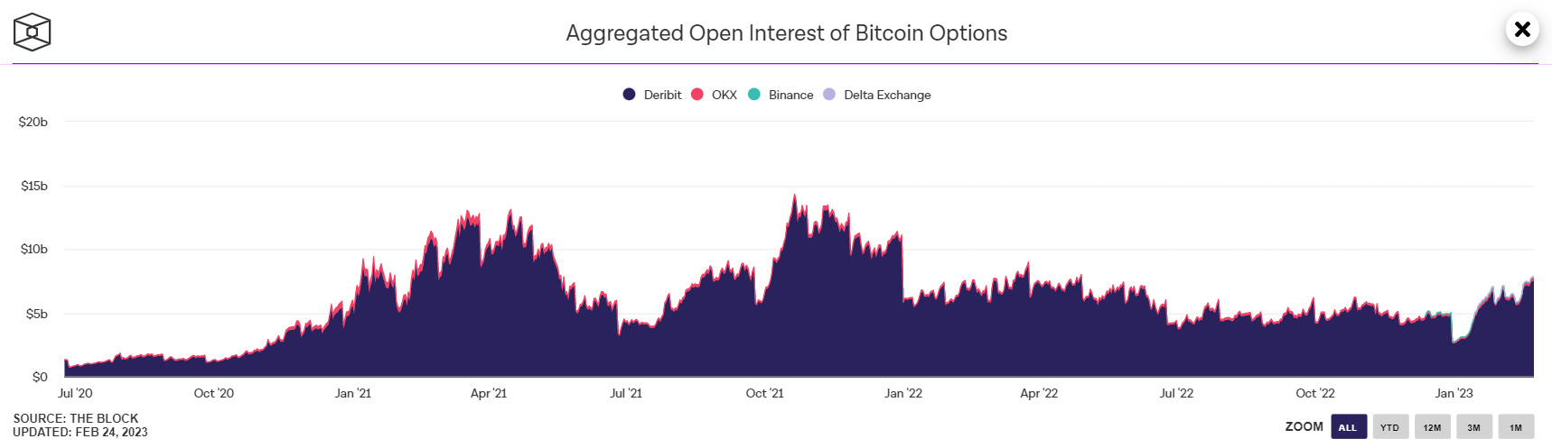 本周早些时候,主要加密衍生品交易所的比特币期权总未平仓合约(即现有期权合约的总价值)达到近 10 个月以来的最高水平,近 78.3 亿美元。期权是一种更复杂的投资工具,通常被更“成熟”的投资者群体用于对冲和进行价格方向押注。