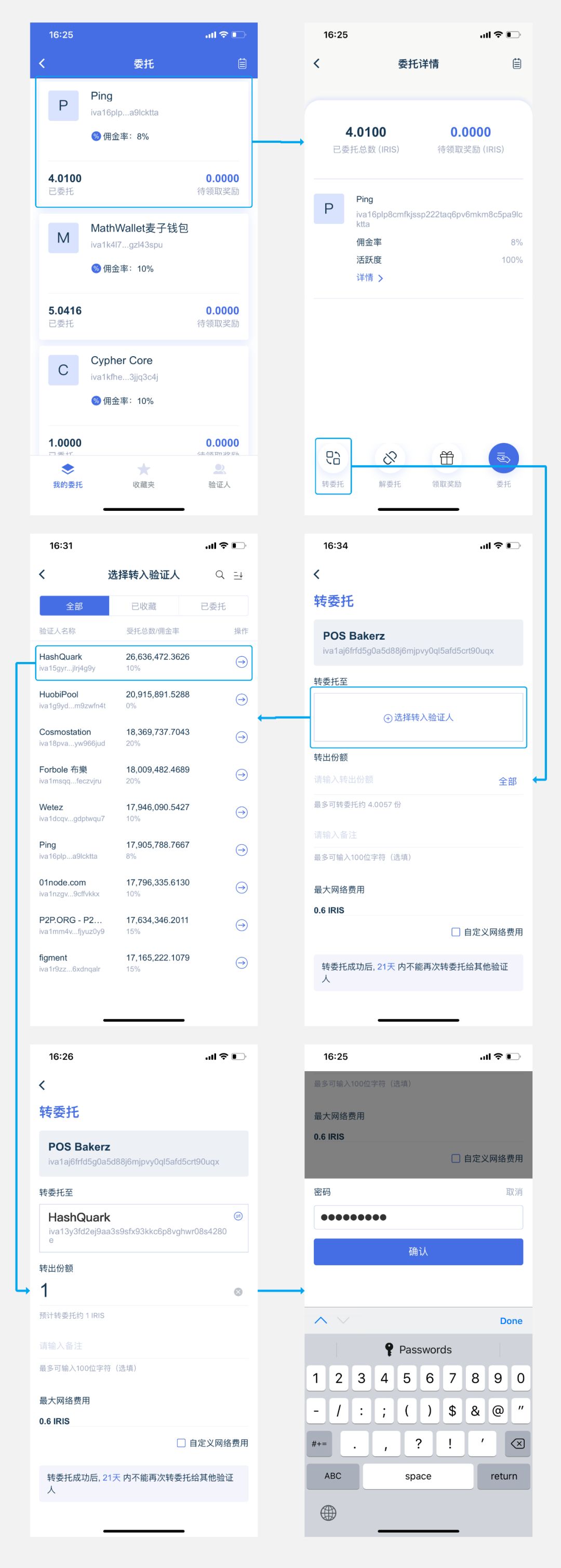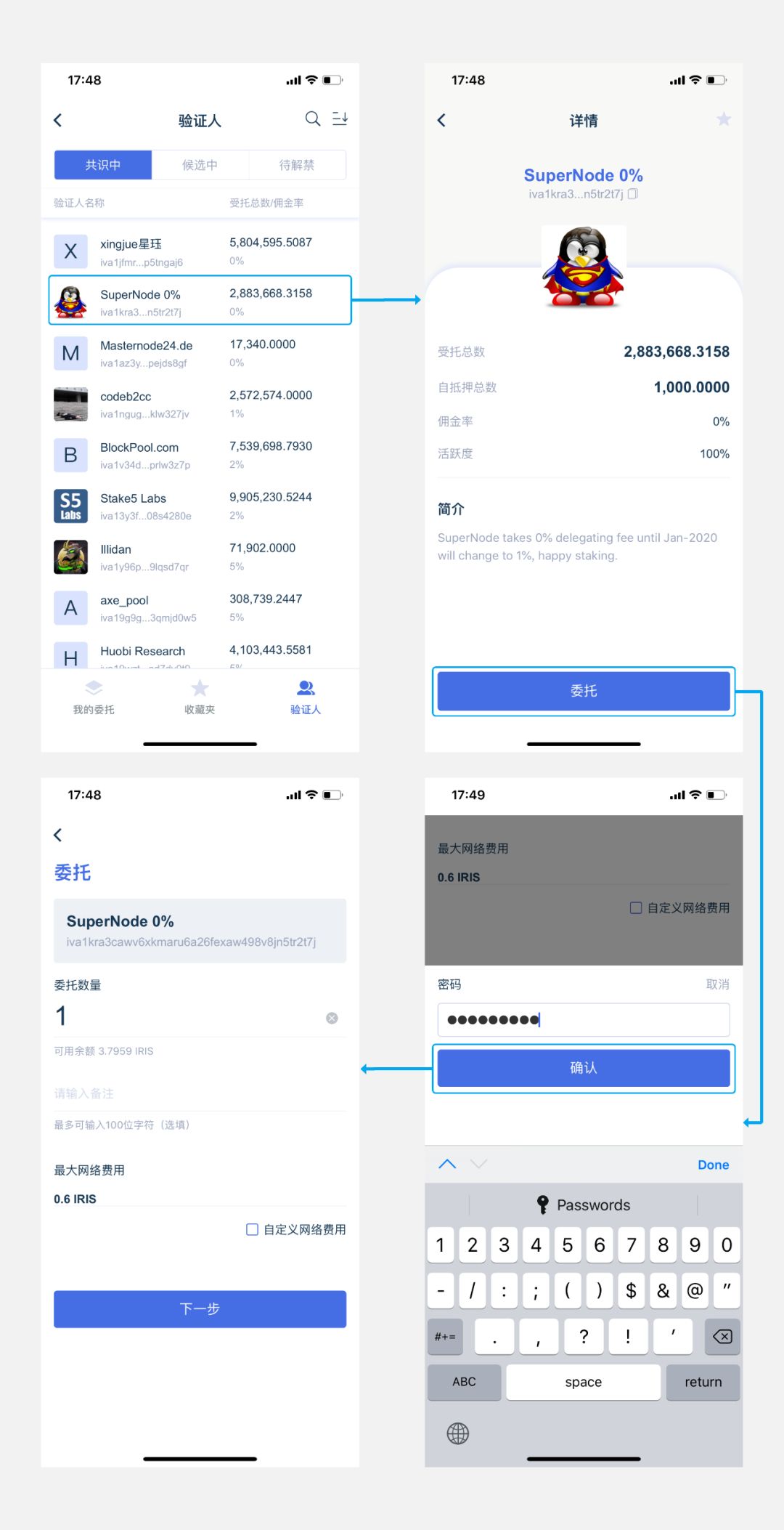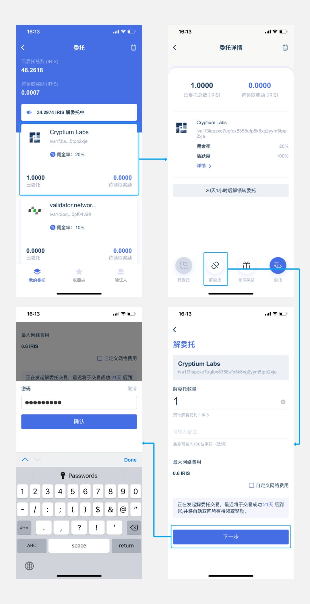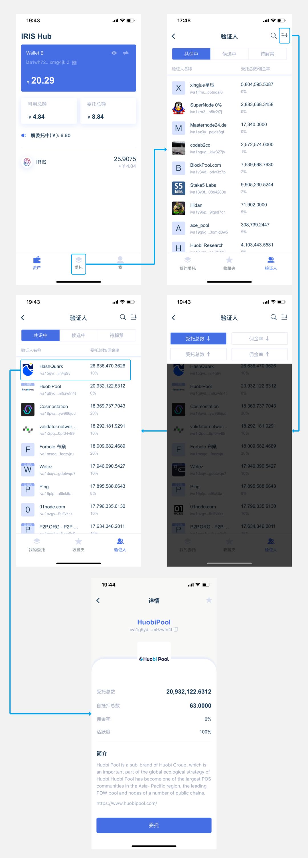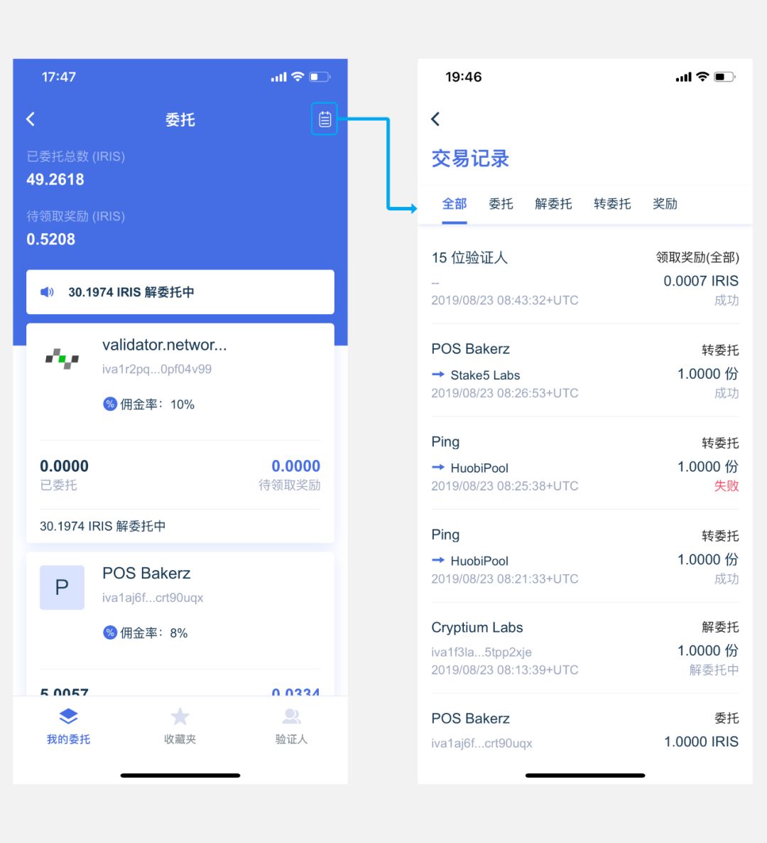 在IRISnet上的验证人状态包括共识中、候选中、待解禁三种状态: