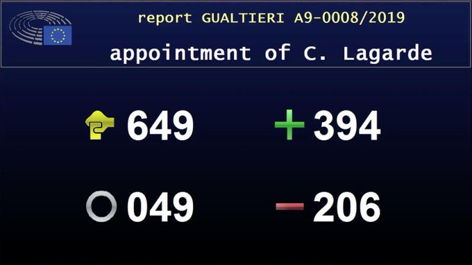 本周二欧盟经济和货币事务(ECON)委员会发布推特称,前国际货币基金组织总裁克里斯蒂娜·拉加德(Christine Lagarde)在无记名投票中以394票支持、206票反对当选欧洲中央银行主席。