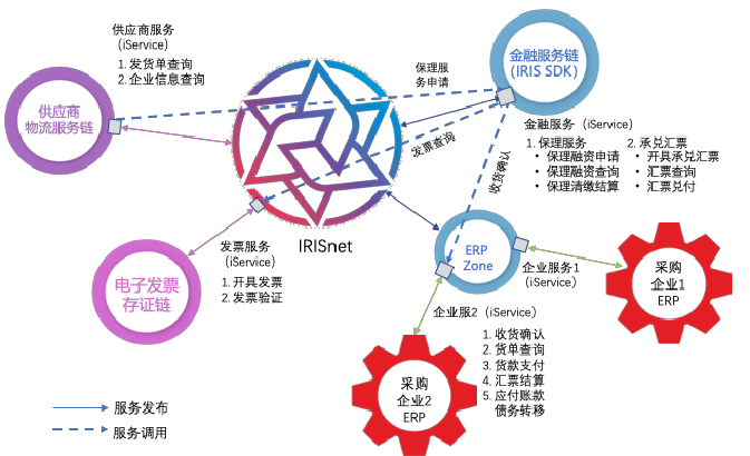 2)通过iService服务定义,业务各方可以自定义服务的可见范围,甚至指定服务的使用者,业务的各个参与方通过相互调用接口可以实现交互,而所有的交互过程和结构通过枢纽底层的区块链跨链协议达成交易共识,记录,实现对交互过程的全程跟踪,并提供非侵入式的审计功能,为业务交互方提供可信交互的保障,例如:采购方企业可以将ERP的部分功能接口采用iService框架发布在枢纽上,比如到货查询功能;第三方的电子发票存证链也可以在枢纽上发布相应的iService服务接口,比如发票验证服务。