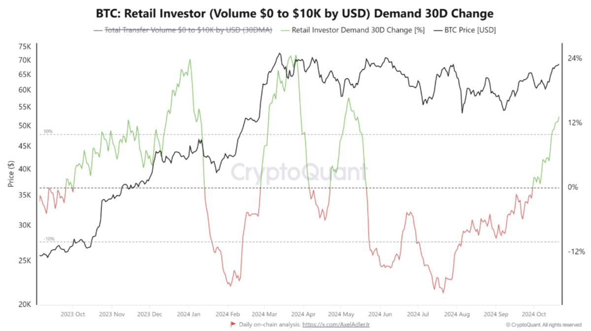 比推消息,据 The Block 报道,CryptoQuant 分析师在周二的一份报告中表示,在过去 30 天里,散户需求增长了约 13%,突显出与 3 月份历史高点类似的情况。但目前比特币零售需求的增长与机构兴趣的增长是同步的,尽管散户投资者正在重返市场,但机构投资者全年都在稳步增加对比特币的敞口。