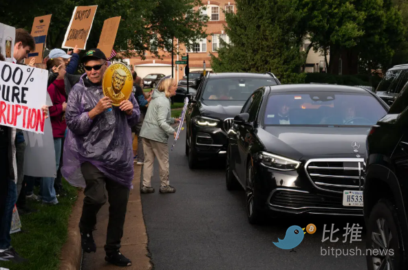 抗议者聚集在弗吉尼亚州斯特林市特朗普国家高尔夫俱乐部外,宾客们正陆续抵达参加加密货币晚宴。该活动同时引发民主党人、政府监督机构乃至部分共和党人士的强烈批评。