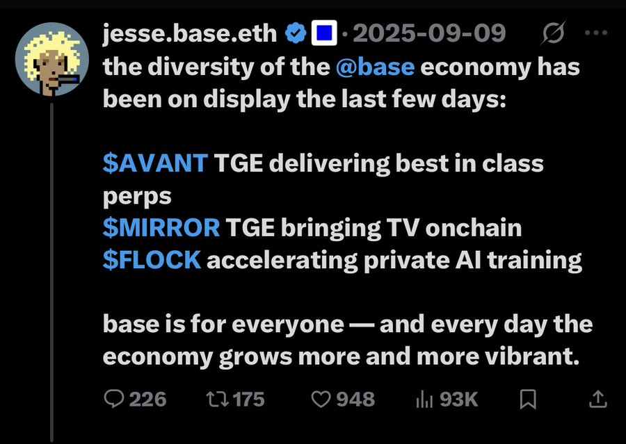 图:Coinbase 创始人 Jesse 发推称赞 AVNT 是 Base 上的顶级永续合约 DEX