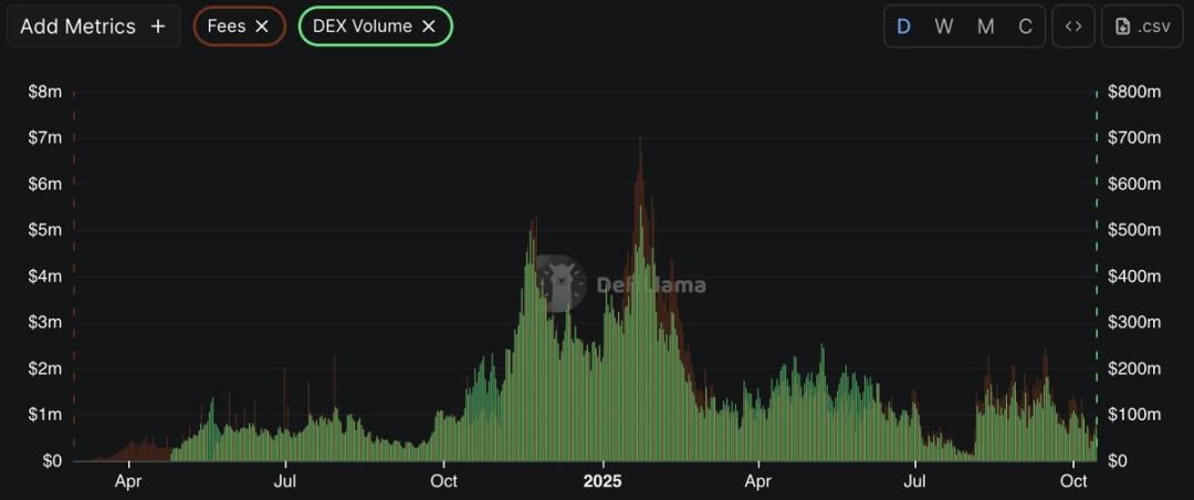 2023 年 Memecoin 热潮始于 Solana,如今它很可能再次成为热潮的中心。尽管目前 Memecoin 情绪与链上活跃度处于低点,但只需一点上涨势头,就能迅速扭转局面。如下图表所示,pump.fun 的交易量与手续费自 9 月中旬以来持续下滑 —— 尽管比特币已从 9 月低点回升,并在 10 月创下历史新高,但链上活跃度并未随之回暖。