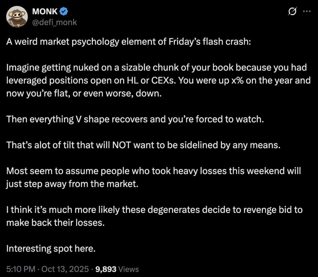 尽管上周五的崩盘让许多人对杠杆心生畏惧,但交易者对高收益投资机会的渴望并未消失,甚至可能因想通过复仇交易挽回损失而更加强烈。流动性不会凭空消失,它只会流向最优质的机会。