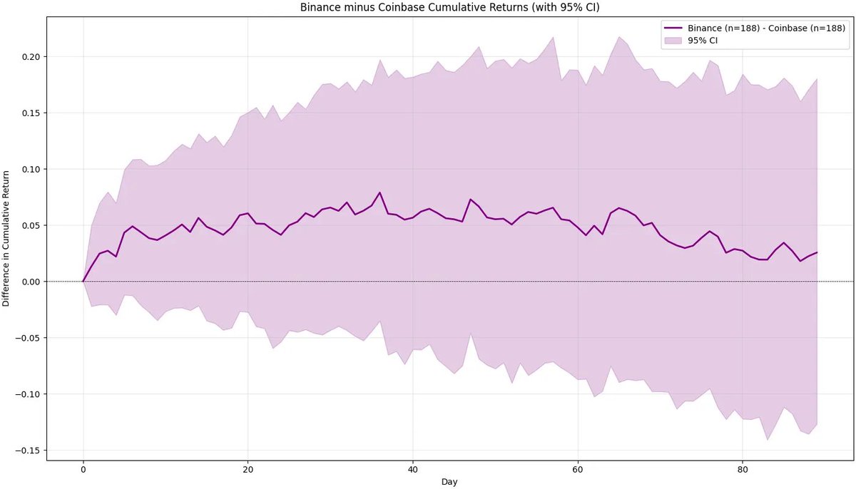你可以清楚地看到——尤其是在 Coinbase 的例子中——币安的影响是正面的,而不是负面的。Coinbase 上的抛售压力远大于币安。当然,一旦考虑到置信区间,这种差异在 95% 的置信水平上不具有统计学意义——但结论仍然相当明确:币安上币的表现优于 Coinbase 上币。