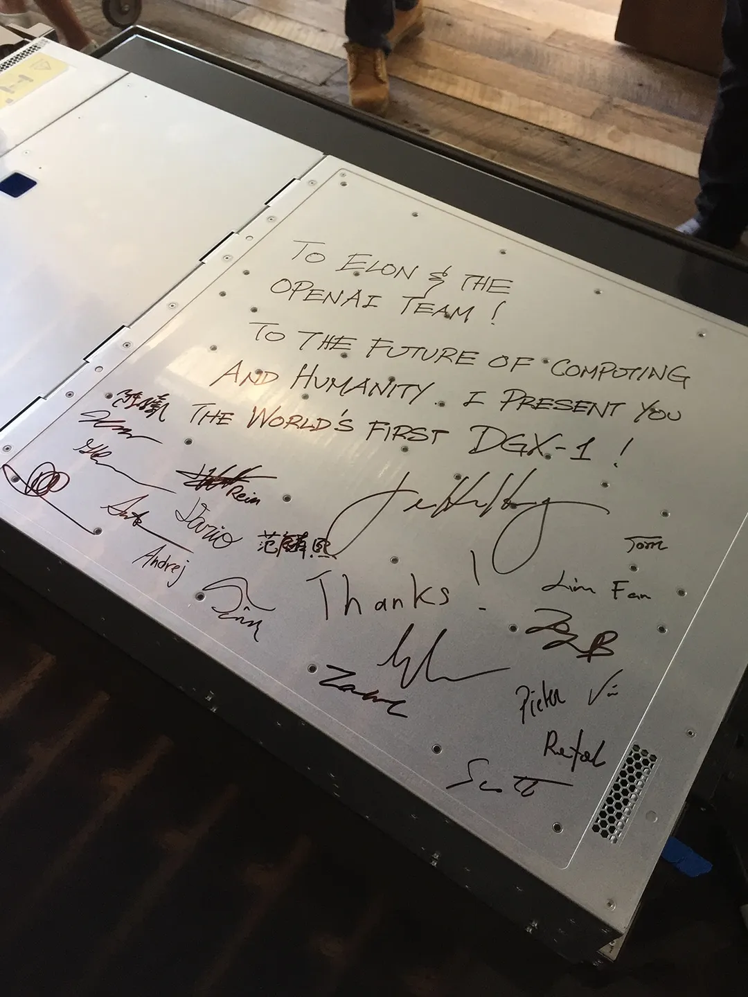 黄仁勋留下了一句话:“为了计算和人类的未来,我捐出世界上第一台DGX-1。”
