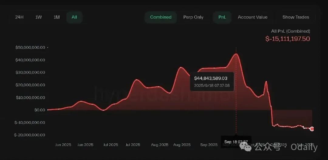 这场循环在十月重复了不下十次。像一个输红眼的赌徒,不断“补仓”,但每一次补仓都被更猛烈的下跌无情吞噬。10 月 11 日、10 月 14 日、10 月 23 日、10 月 30 日……他的仓位被一次又一次地清算。尽管期间市场偶有反弹,让他小额仓位出现近百万美元浮盈,但相较于巨大的亏空,这只是杯水车薪。到 10 月 31 日,他的总亏损已达1450 万美元。