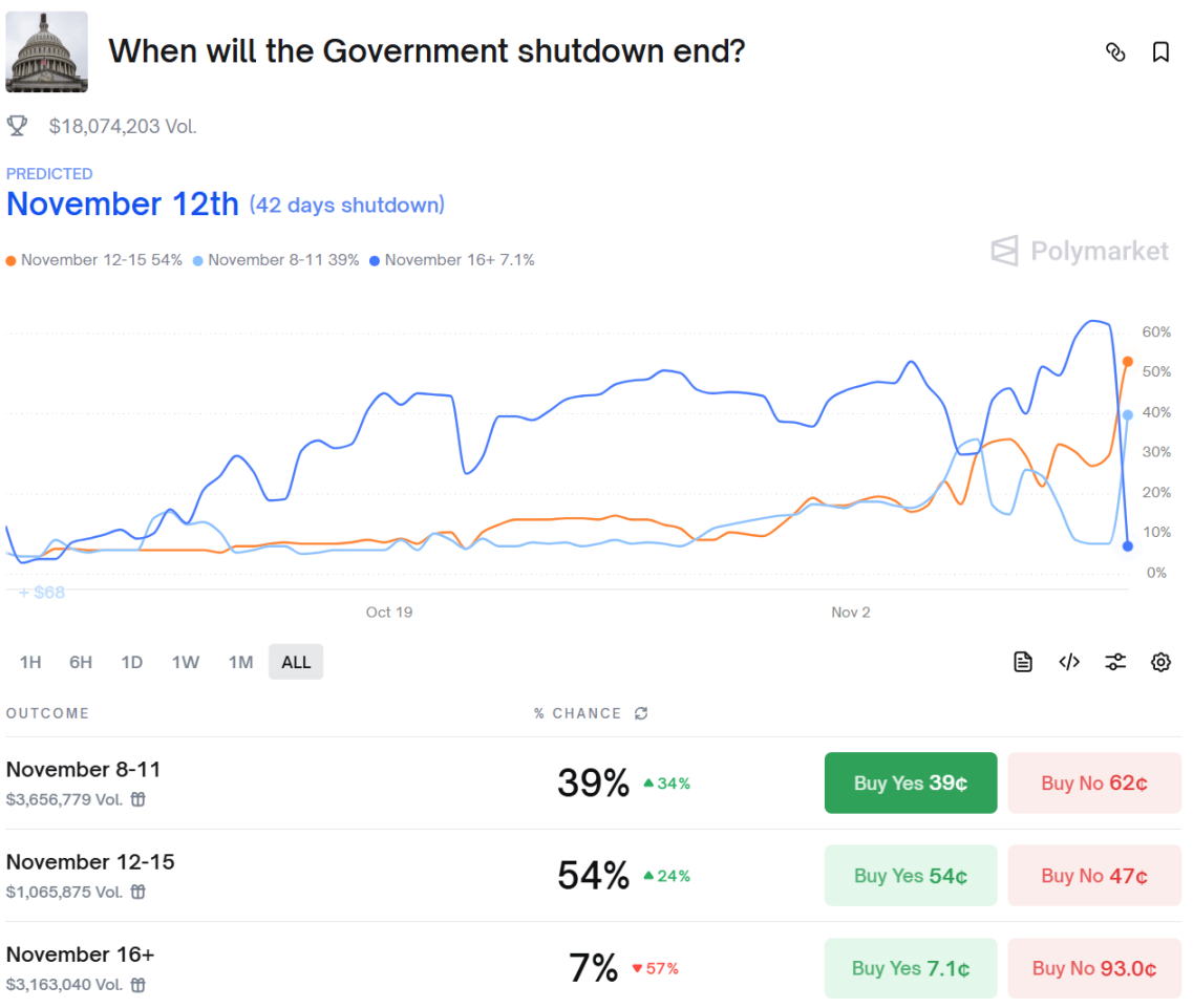 Polymarket 上数据显示,市场押注美政府停摆结束时间为 11 月 11 日前的概率升至 39%,11 月 12 日至 15 日的概率为 55%。目前该预测市场的总交易额超 1810 万美元。