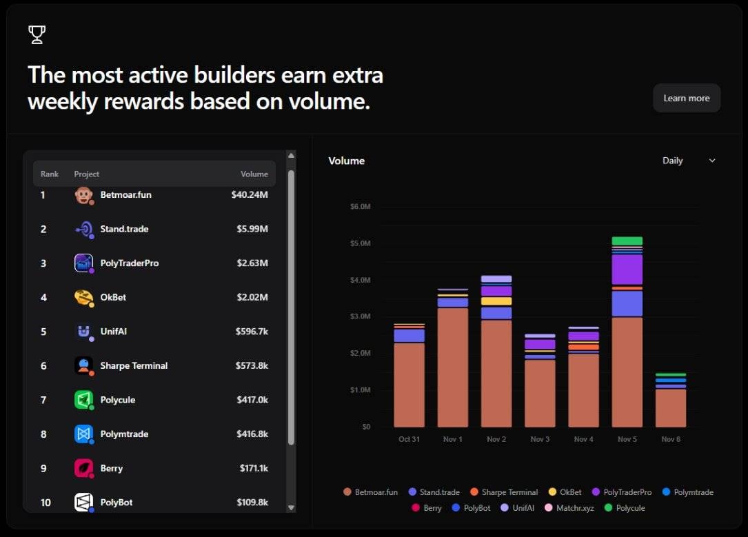 Polymarket似乎在帮助扩大构建者应用的范围,从交易终端到AI助手,并且还创建了类似Hyperliquid的仪表盘,用以展示顶级构建者及其奖励。
