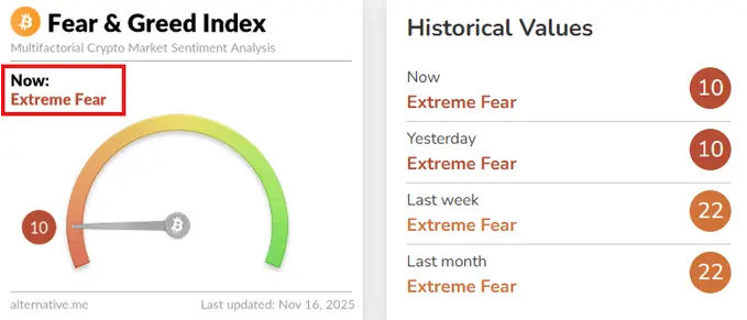 这也解释了市场情绪的突然转变。加密市场恐惧与贪婪指数已正式跌至10,即“极端恐惧”。