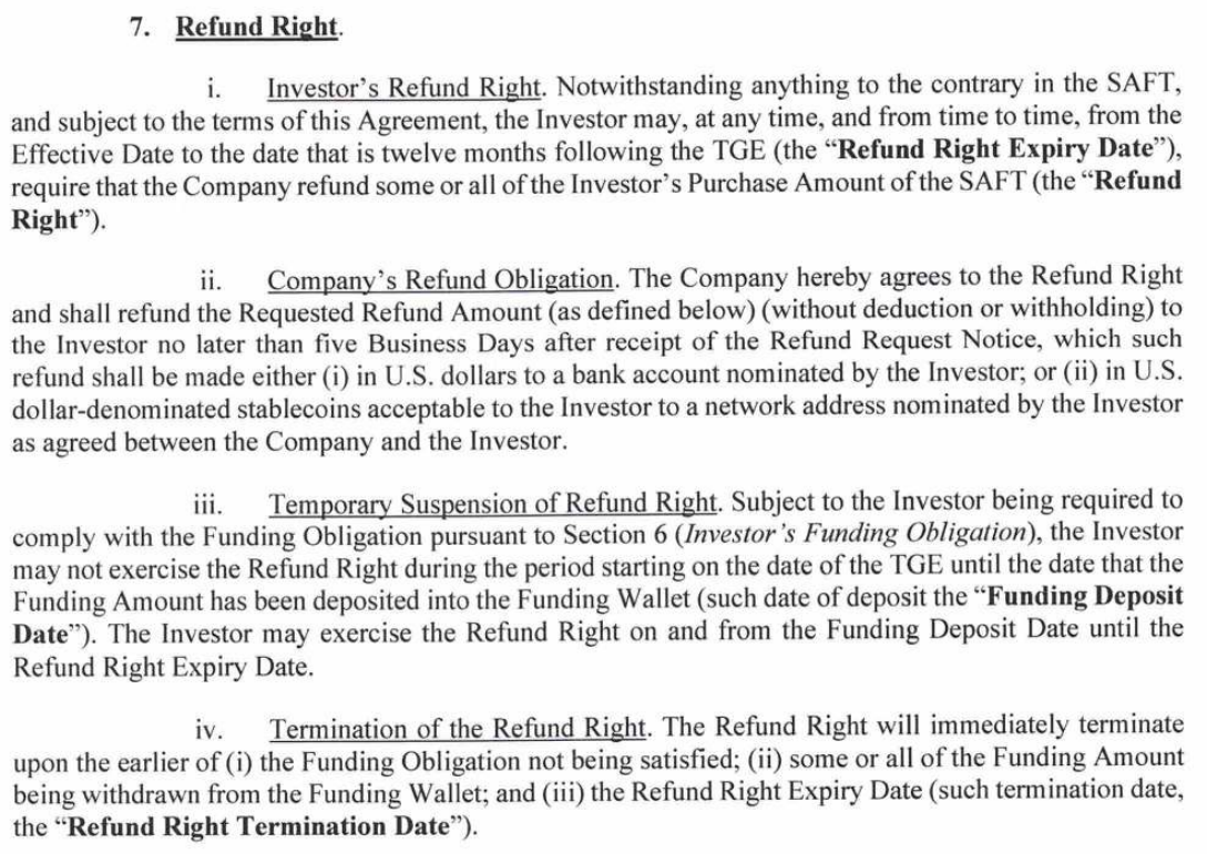 根据 Unchained 披露的文件,Berachain 与 Nova 的投资协议除了标准的 SAFT 协议,还有一份包含退款权的补充协议。这份协议的核心内容包括: