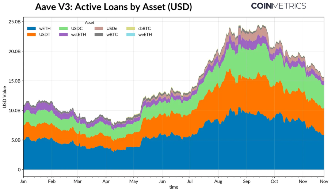 ETH 类借贷也同步收缩,WETH 与 LST 相关贷款减少 35–40%,显示循环杠杆与收益策略大幅退出。
