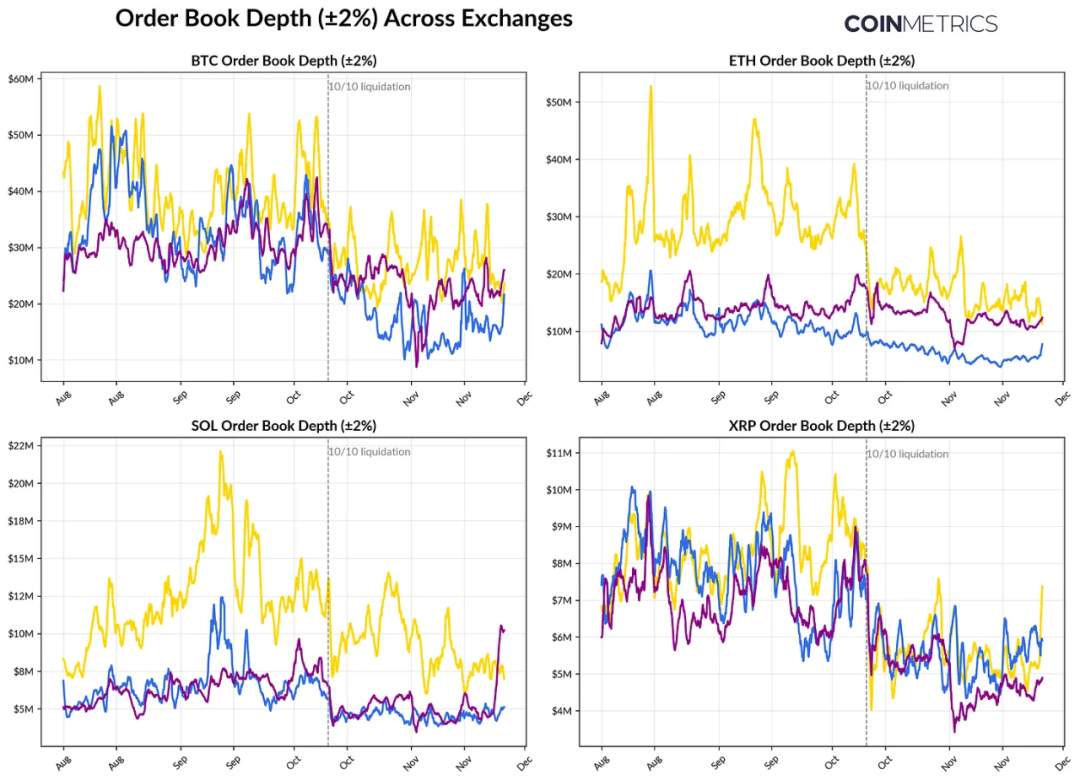 现货市场流动性在 10 月 10 日清算后未能恢复。主要交易所的挂单深度(±2%)至今仍比 10 月初低 30–40%,说明随着价格企稳,流动性仍未修复。由于挂单减少,市场更脆弱,轻微的交易就可能带来过度价格冲击,加剧波动并放大强平影响。
