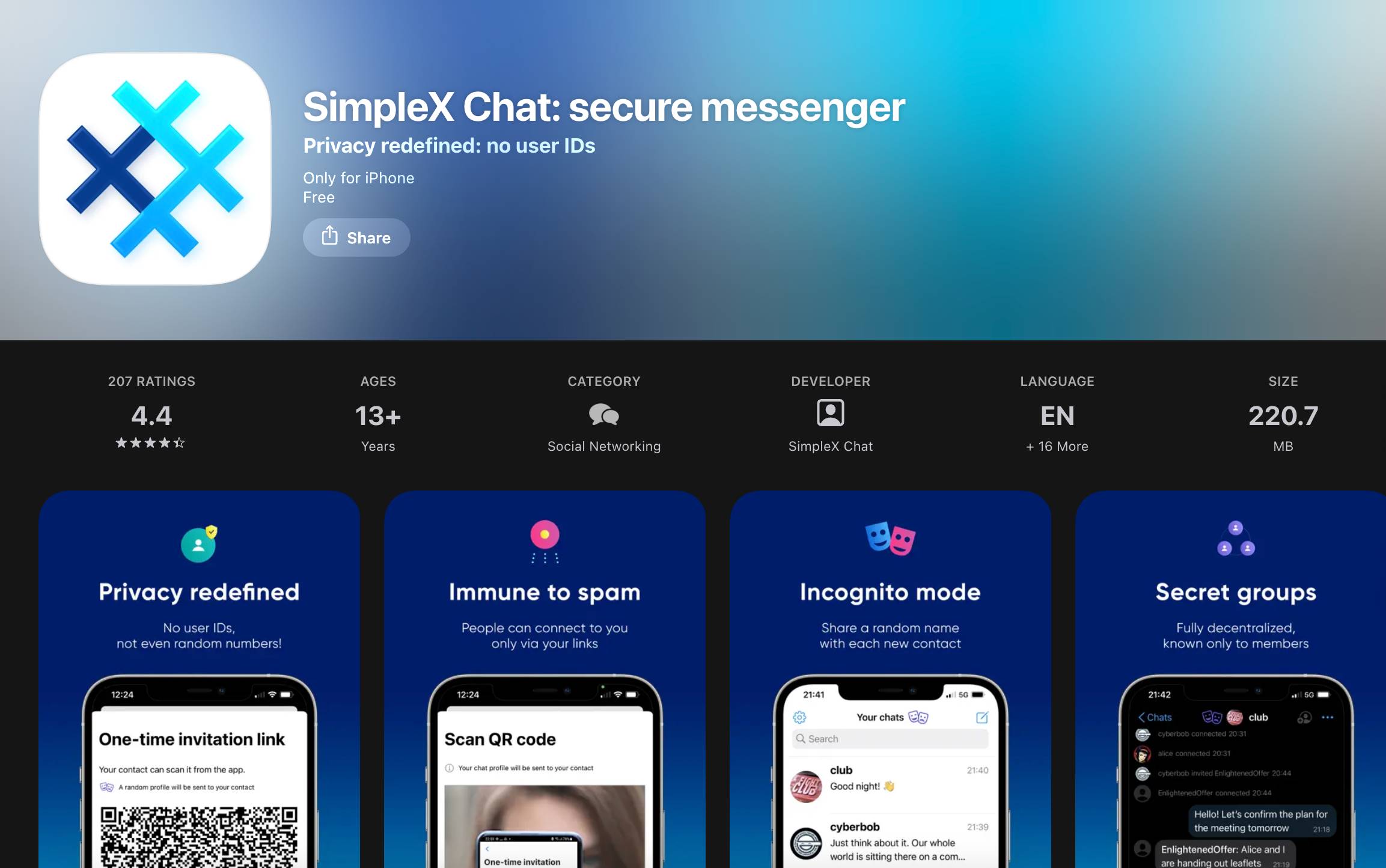 如果说 Session 的卖点是「不需要手机号」,SimpleX 则更激进: