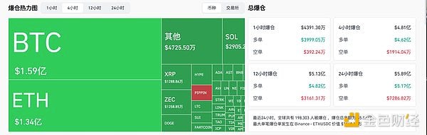 Coinglass数据显示,过去4小时全网爆仓4.81亿美元,其中多单爆仓4.62亿美元,空单爆仓1914.04万美元,主爆多单。其中BTC爆仓1.59亿美元,ETH爆仓1.34亿美元。最近24小时,全网超过19.8万人被爆仓,最大单笔爆仓单发生在Binance – ETH/USDC,价值 $1448.17万。