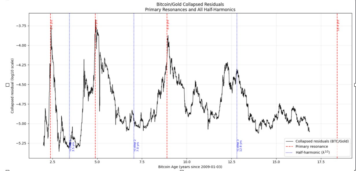 DSI 的基模波长参数 λ = 2.07(对数时间),大致对应泡沫间隔的两倍。2017 年泡沫是最后一个基模,2021 年是第一次谐波,2025 年在本框架下预期不会出现泡沫。下一轮以黄金计价的比特币峰值预计在 2026 年四季度(小波分析最低值)至 2027 年二季度(傅里叶分析值)之间出现。