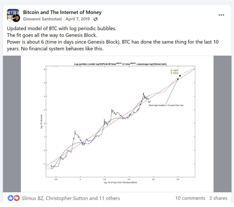 那 2011 年的泡沫呢?大家习惯把 2011 年的大泡沫当作“早期异常”直接忽略。但 2011 年的泡沫其实和 2013 年、2017 年一样重要,理应同等对待。如果泡沫并非以线性周期出现,而是以对数周期出现呢?这种现象被称为对数周期行为。