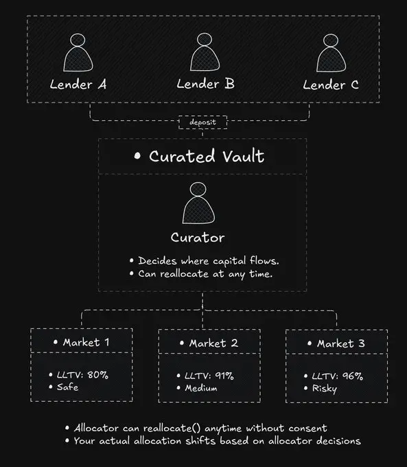 主理人决定哪些市场获得资金,且可以随时重新分配。放贷人的风险敞口会随着主理人的决策而改变,且无法预测或控制。正如某推特用户所言:「主理人是在和借款人 PvP,但借款人甚至不知道自己在被收割。」