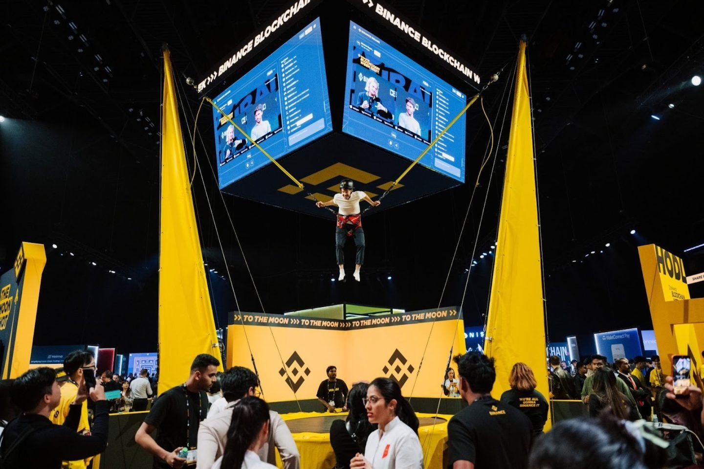 迪拜可口可乐竞技场外,黄沙色的小清真寺被霓虹灯包围,夜色里看上去有些失真。走进场馆,通往主会场的是一条条漆黑通道,墙面嵌着明黄色的灯带,模仿着币安的 Logo;一旁是通往下一层的巨大黄色滑梯,对面则排着队等待蹦床的观众。