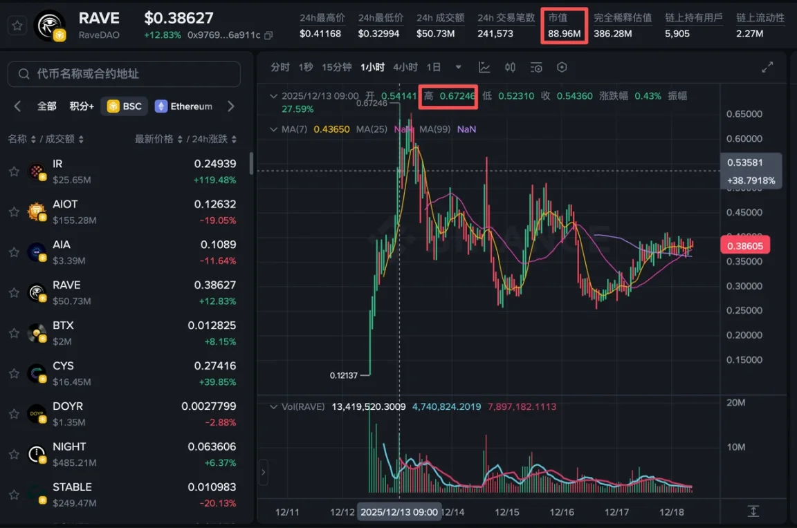 12 月 13 日,RAVE 价格一度触及 0.67 美元,24 小时涨幅超 410%;