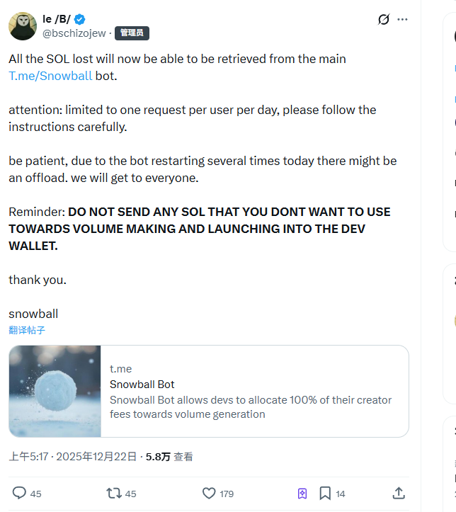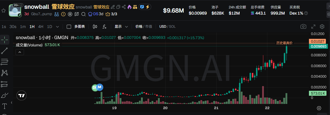 一个叫 Snowball 的 Meme 币,12月18日在 pump.fun 上发射,四天时间市值冲到1000万美元市值,还在创新高;而中文圈几乎没什么人提。