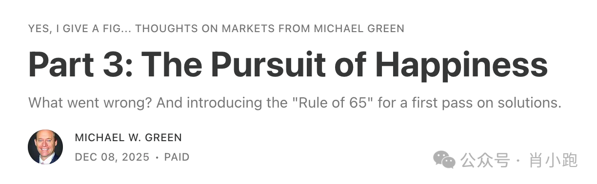 但Green老师没有只管杀不管埋,他最后提出了一套非常硬核的解决方案,叫“65号规则”(Rule of 65),核心思路就是我们中国人都很熟悉的“打土豪分田地”:(1)给企业加税(但给投资免税);(2)大公司借钱不能再抵税,坚决打击金融空转;(3)给牛马减负: 大幅降低普通人的工资税(FICA),让大家手里的现金变多。缺的钱从哪补?让富人多交点,把富人的社保税上限打开。