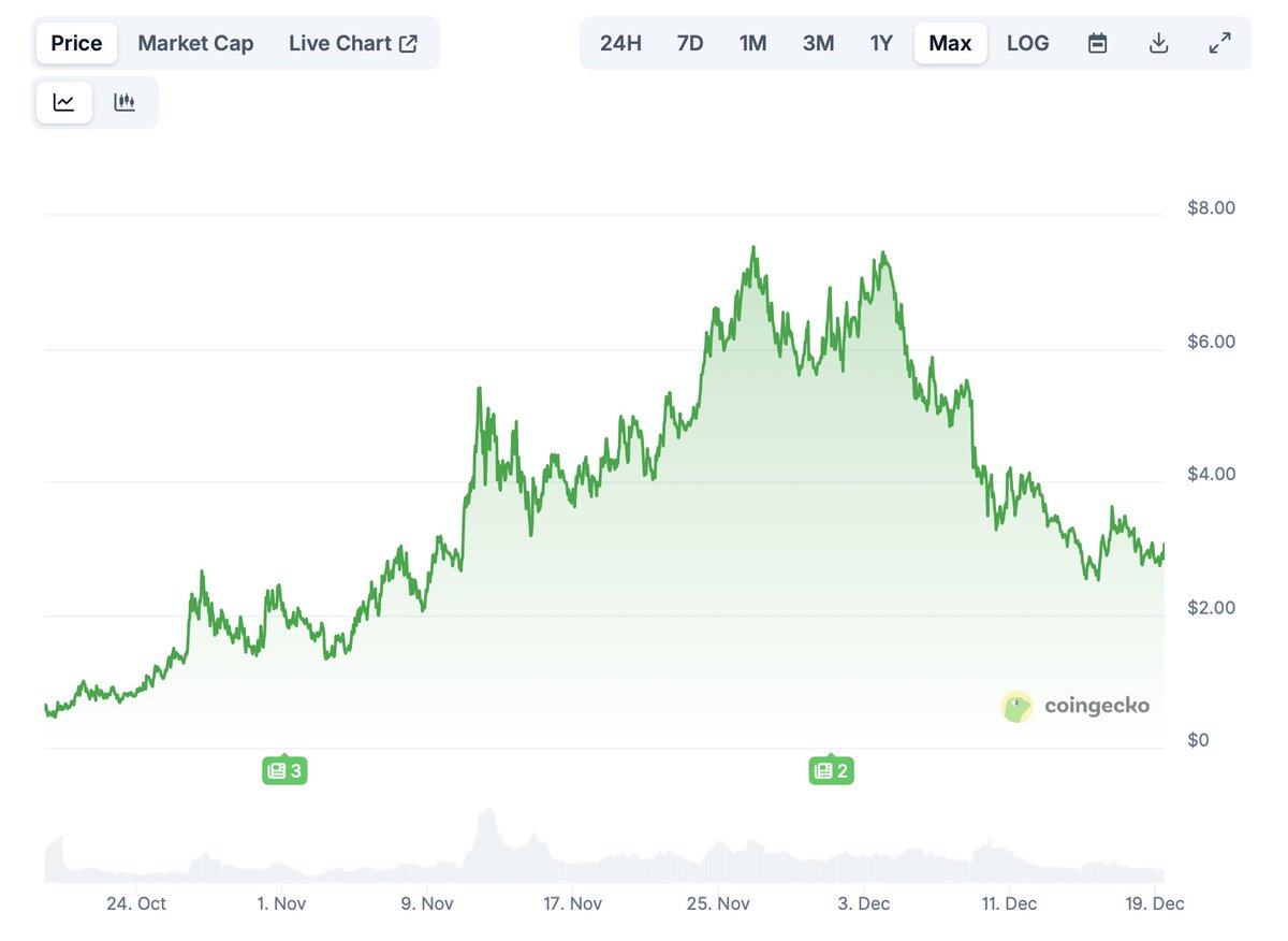 FOLKS 与众不同:它是一种借贷代币,在“行情如此垃圾”的一年里,它被视作 Alpha。公式:“币安和 Kraken 从第一天起就表示了支持,跨链池不断增长,没有明显的天量解锁。”最后一点非常重要。直到 12 月 15 日代币解锁其表现都不错。
