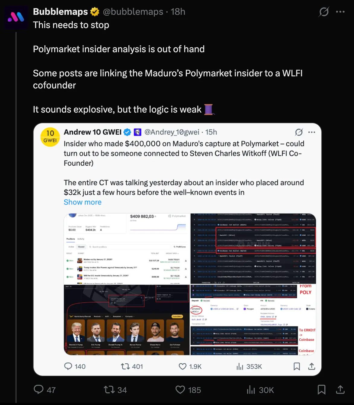 链上分析平台 BubbleMaps 随后发表了不同观点。他们认为这种“时间与金额相似”的推论过于肤浅,并指出链上存在至少 20 个符合此模式的钱包,而且 Andrew 的论点中也缺乏直接的链上资金移动证据,因此没有可靠的证据说明该 Polymarket 账户与 WLFI 联创有关。