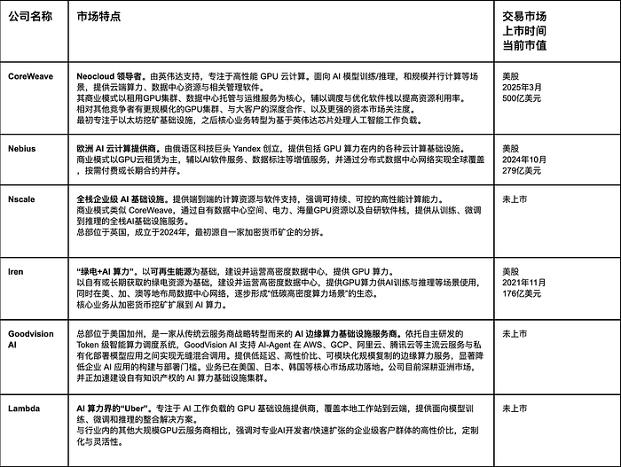 Neo Cloud中的头部玩家无疑是Coreweave;作为2025年最引人注目的科技股之一,Coreweave目前的核心业务是偏向AI训练与推理场景的云计算及GPU加速的基础设施服务。当然,看准算力出租的新型企业不仅只有CoreWeave;Nebius、Nscale、Crusoe都是其强有力的竞争者。