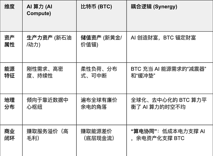 其次,AI 算力作为一种消耗性的生产力资产,其核心成本源于电力,其价值产出则取决于算法效率;而 BTC 作为去中心化的储值资产,其本质是能源的货币化体现,天然具备平衡全球算力时空不均的“蓄水池”功能。AI 需要持续稳定的电力,而 BTC 挖矿可以消化掉电网中因为时空不均而产生的废电。即BTC挖矿通过“需求响应(Demand Response)”来稳定电网:当电力过剩(如风能、光能高峰)时,算力可以作为负荷吸收多余电力;当电力紧缺(AI 运算高峰)时,挖矿算力可以瞬间关机,将电力释放给更高价值的 AI 集群。