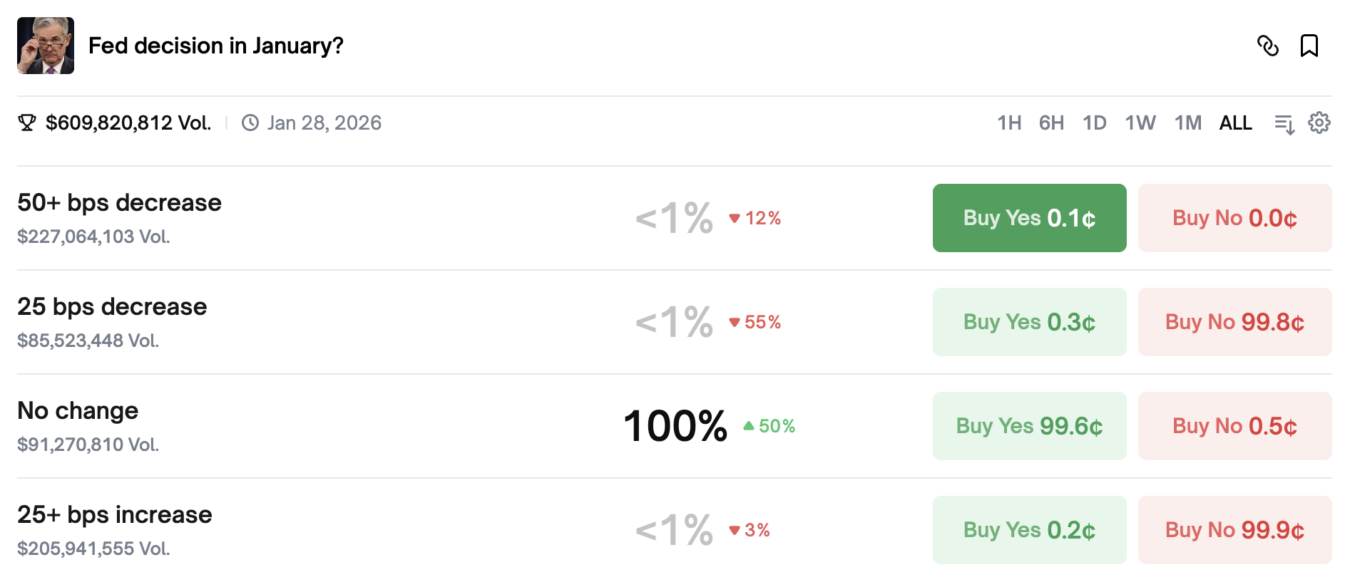 北京时间 1 月 29 日(本周四)凌晨 3 点,美联储即将公布 2026 年的首份利率决议;半小时后,美联储现任主席鲍威尔将召开货币政策新闻发布会。不过,本次美联储的利率决议悬念并不多,市场已经普遍认为美联储将做出维持利率不变的决定。Polymarket 数据显示,维持利率不变的概率已经接近于 100%。