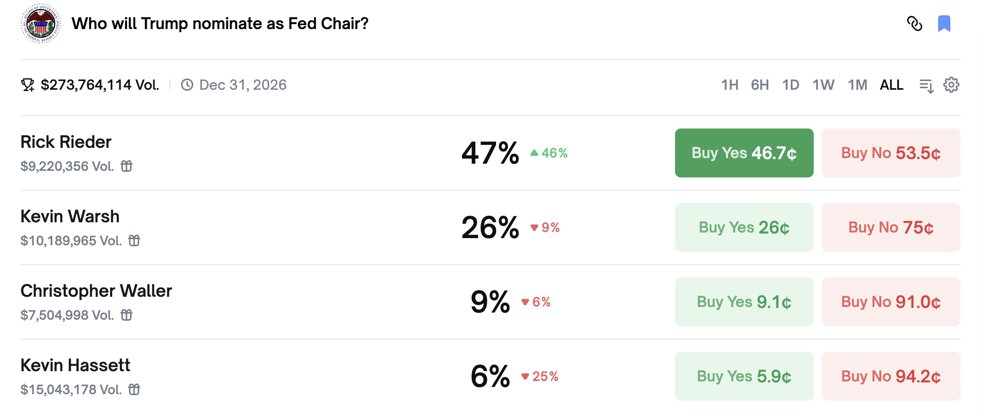 除了本周的 FOMC 会议外,美联储主席的继任者也是能影响市场的宏观大事件。目前人选已经缩小到了凯文·哈塞特(Kevin Hassett)、凯文·沃什(Kevin Warsh)、里克·里德尔(Rick Rieder)和克里斯托弗·沃勒(Christopher Waller)4 人身上。据 Polymarket 数据,Rick Rieder 目前被特朗普提名概率最高,达 47%;Kevin Hassett 被提名概率最低,达 6%。