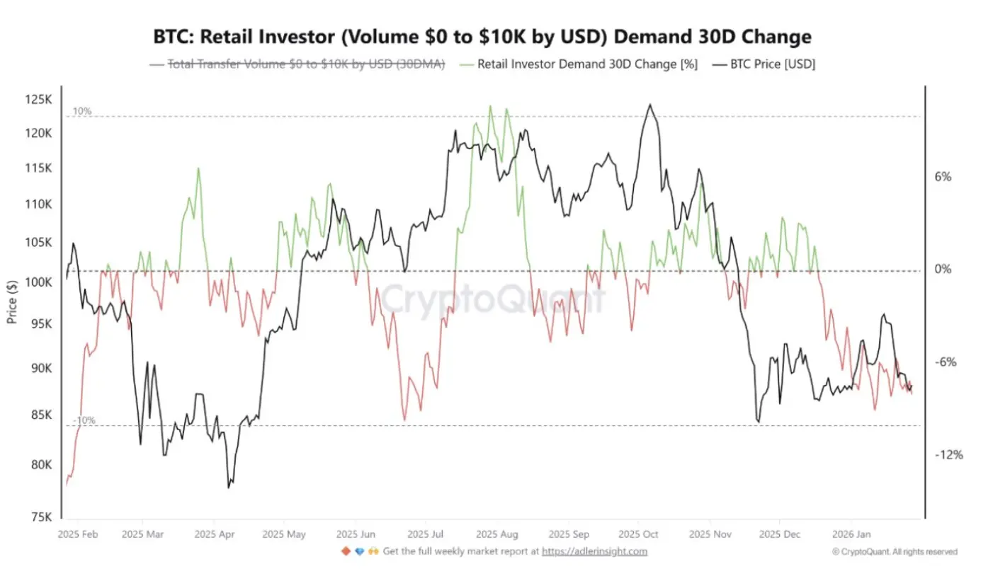 同时,零售投资者也在撤离。链上数据显示,0 至 10,000 美元的小额交易在过去一个月急剧萎缩,不只买入减缓,参与人数实质下降。而当 ETF 买盘消失、散户退场,市场只剩短线交易者和杠杆投机,波动性必然放大。