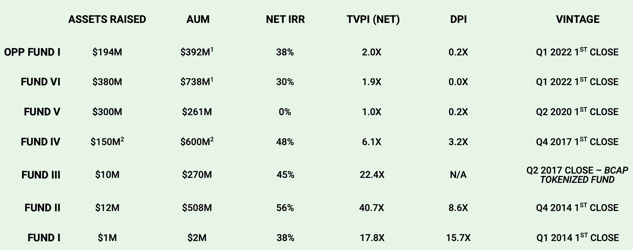 从不同年份(vintage)来看,这组基金回报呈现出非常清晰的“周期断层”:2014–2017 年成立的基金(Fund I、Fund II、Fund III、Fund IV)整体回报显著领先,TVPI 普遍在 6x–40x 区间,Net IRR 维持在 38%–56%,同时也已经具备较高的 DPI,说明这些基金不仅账面收益高,且已经完成了大规模兑现,吃到了早期加密基础设施和头部协议从 0 到 1 的时代红利。