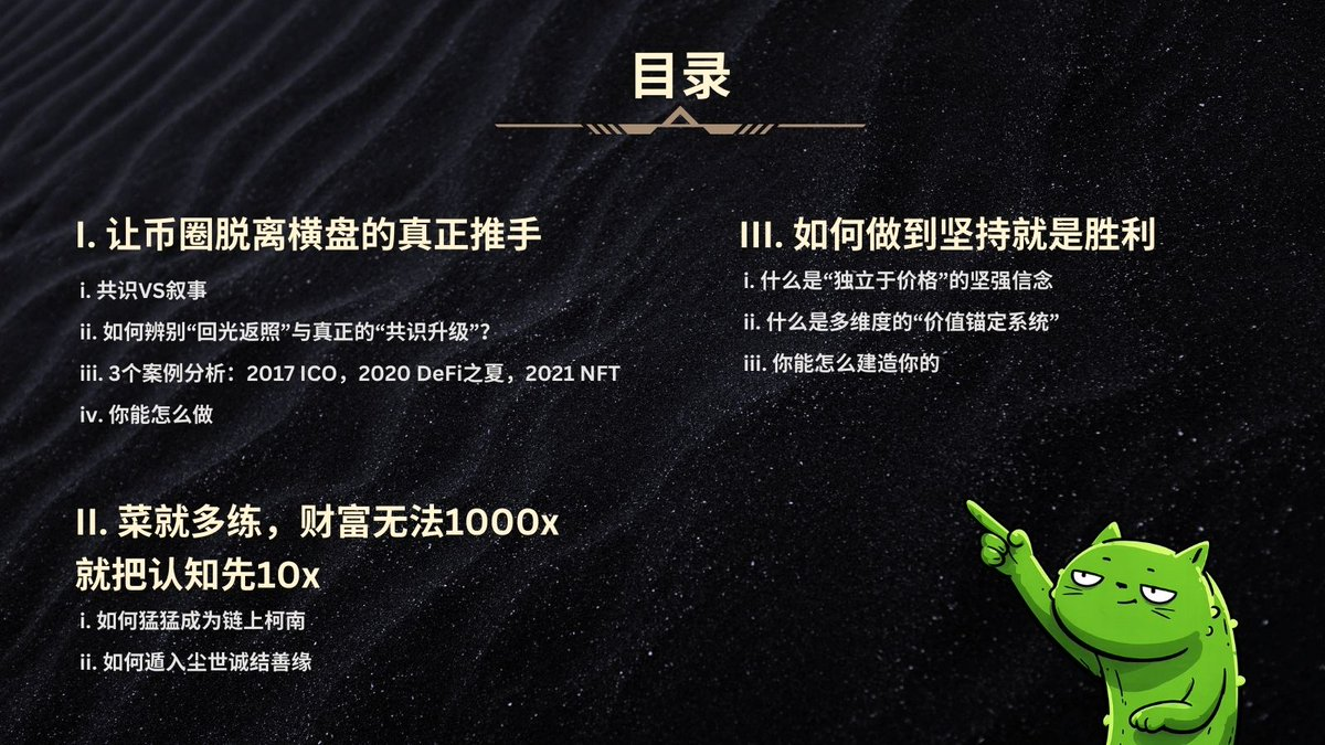 他们总认为下一轮周期将由某个“更好、更炸”的产品、功能或新叙事触发。但这些都只是果,而非因。真正的转折点,在更深层的共识升级完成之后才会显现。