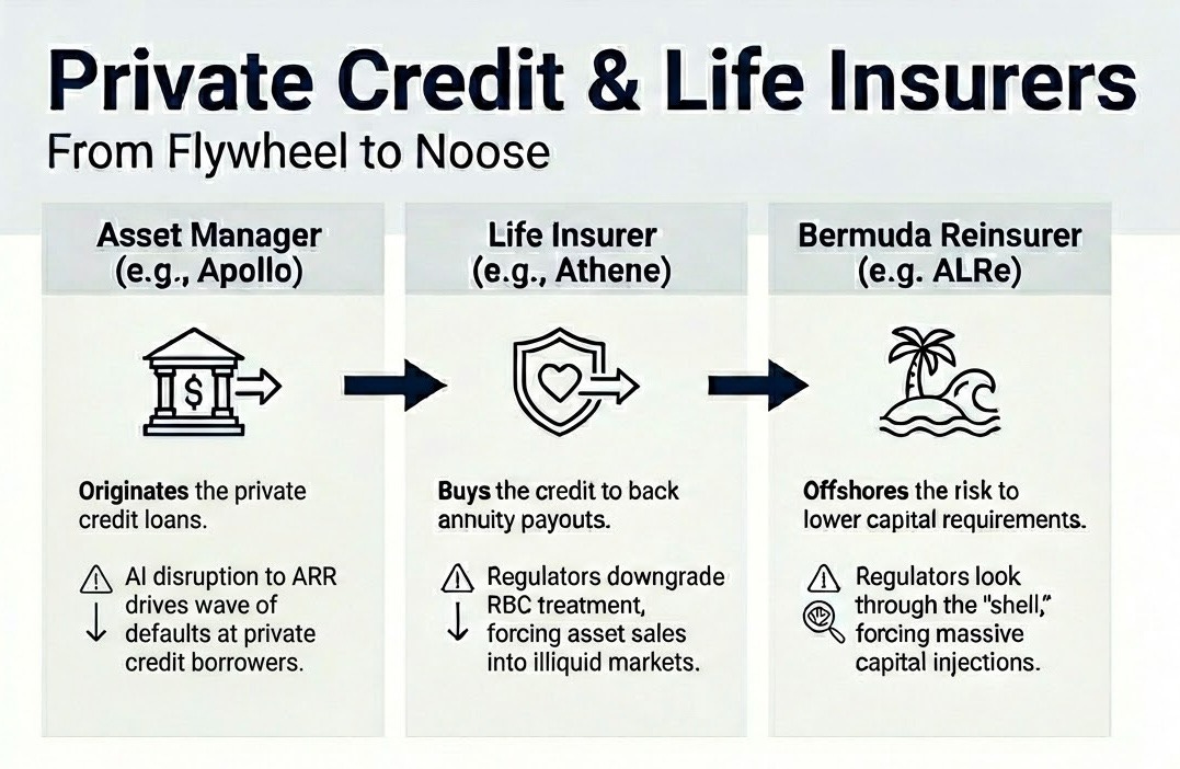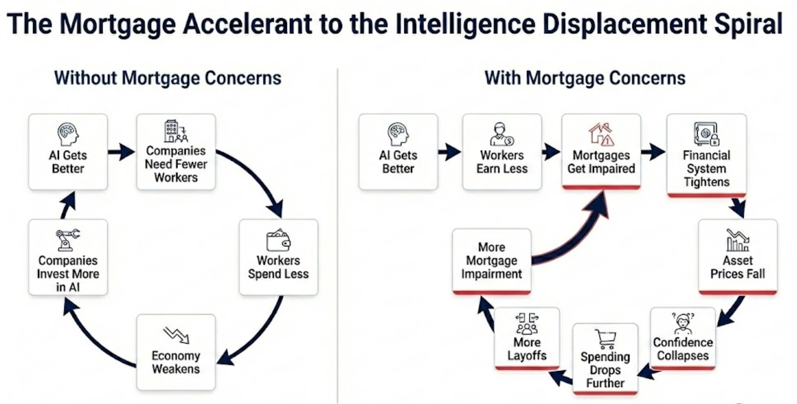 这是一个没有自然制动器的负反馈循环。这就是人类智能替代螺旋。白领工人眼睁睁地看着他们的盈利能力(理所当然地,也包括他们的消费能力)受到结构性损害。他们的收入曾经是 13 万亿美元抵押贷款市场的基石——这迫使承销商重新评估优质抵押贷款是否依然安全。
