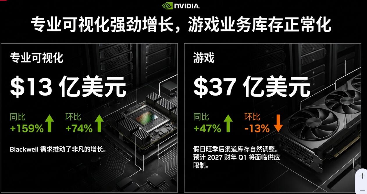 游戏业务四季度同比加快增长,英伟达解释,主要由Blackwell芯片的需求强劲带动。但该业务收入环比下降13%,原因是“假日旺季后渠道库存自然回落”。值得警惕的是,英伟达明确提示:预计一季度及以后,供应受限将成为游戏业务的逆风因素。