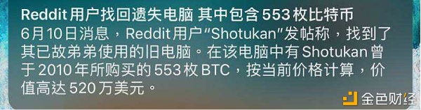 “Reddit用户找回遗失电脑,其中包含533枚比特币。”最近,这条消息从国外传至国内币圈,这533枚比特币当前价值520万美元,消息中还称,那位网名Shotukan的Reddit用户在2010年买了这些比特币,电脑是他从已故弟弟的旧物中失而复得的。